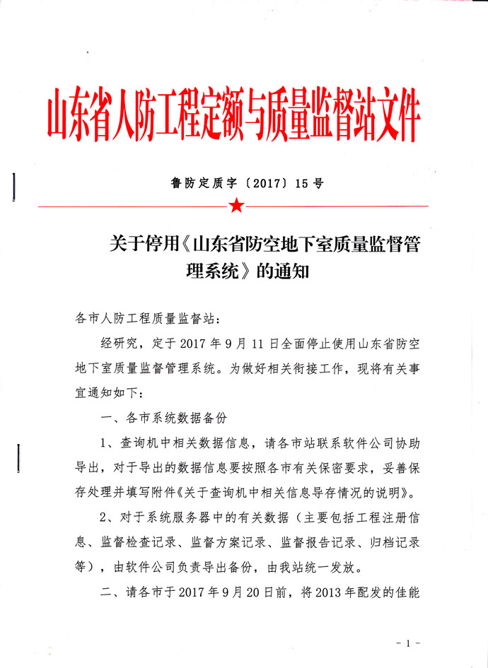 关于停用《山东省防空地下室质量监督管理系统》的通知